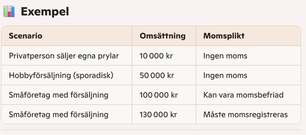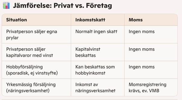 👉 Då räknas det som privat försäljning. Ingen moms, ingen inkomstskatt.